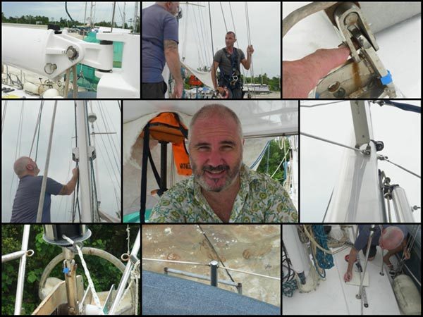 Liz was up there to help our rigger measure the triatic, a feat requiring a certain amount of acrobatics and skill on his behalf. At the time, we were planning a complete re-rig, but our rigger wanted to know why we were getting rid of perfectly good rigging.