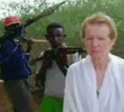 Funds were raised and a private company was employed to broker the payment of the money but in a scenario like this the government has veto on whether the ransom should be paid. Gordon Brown stood firm, so with the government making its stance quite clear on the situation private efforts to raise money by friends and family of the Chandlers continued unabated. Meanwhile we watched in vain as the couple appeared in the news, looking more and more distraught, broken and ill. [Right: Rachel Chandler at gun-point. Source: Enterprise News And Pictures]