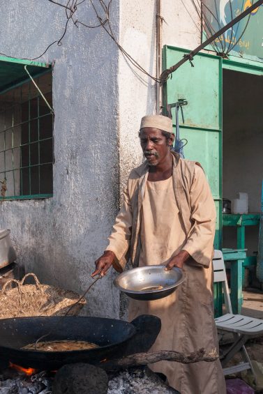 After passing through the market we made our way to the cafe area by the bus station and watched Eritrean refugees hard at work in the kitchens and back streets preparing food. One young Eritrean, who was grating a big lump of dried cheese, explained that he was being paid ten Sudanese pounds a day in wages. The lump of cheese he was grating cost £18.